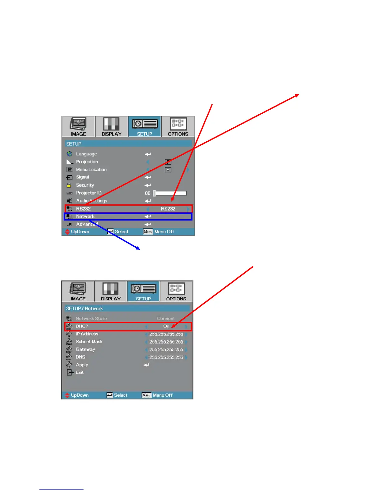 2. select “SETUP”->“ Network ”, then press “Enter” on the keypad, enter below OSD.