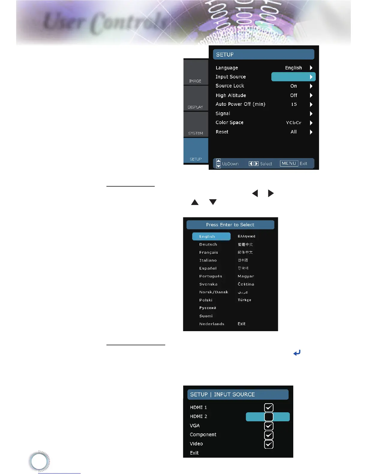 the sub menu and select which sources you require. Press “Enter”