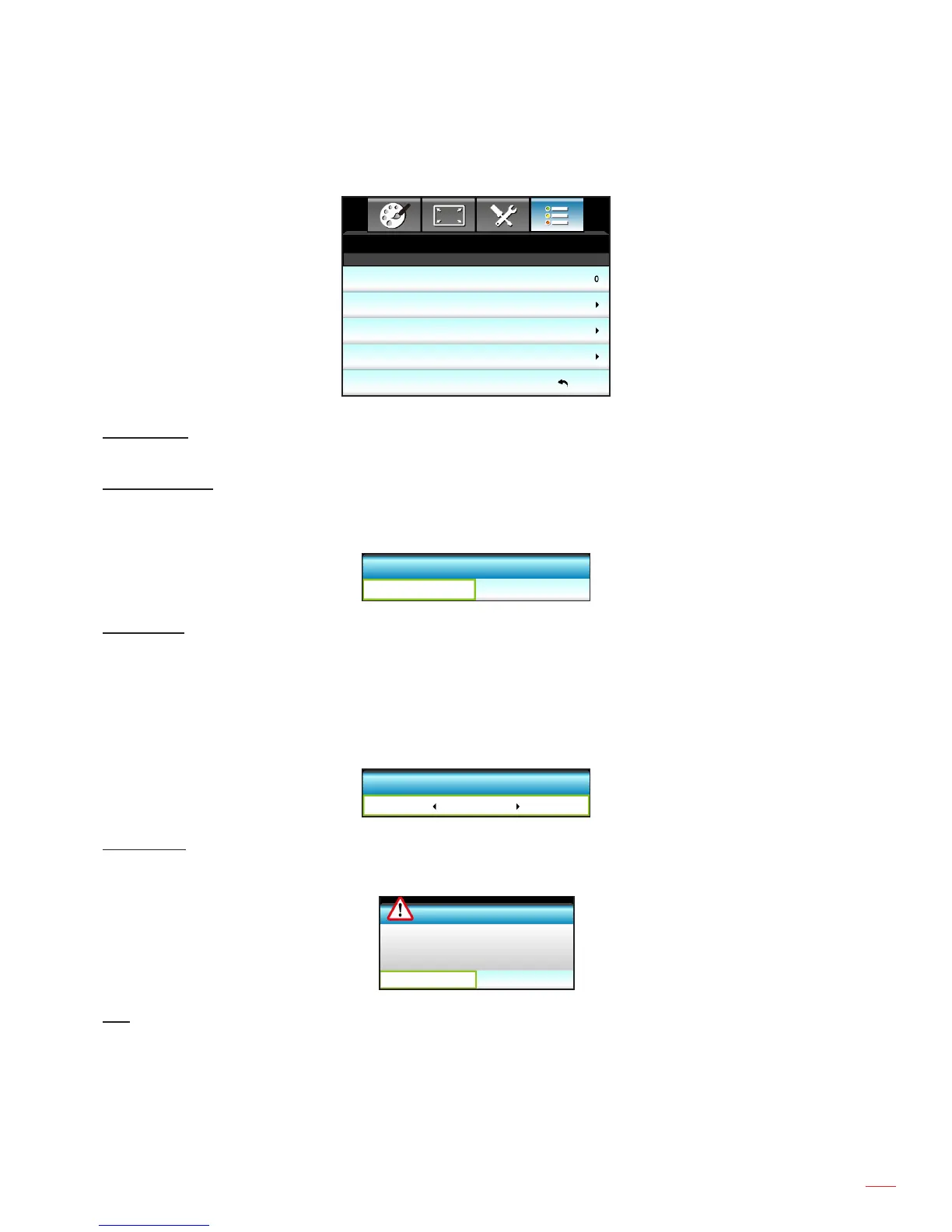 Choose this function to show or to hide the warning message when the changing lamp message is displayed.