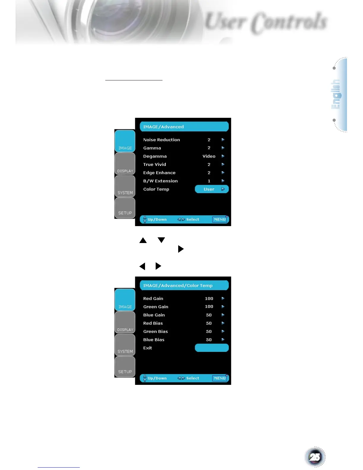 2) Use “ ”, “ ” to highlight the desired adjustment items, then