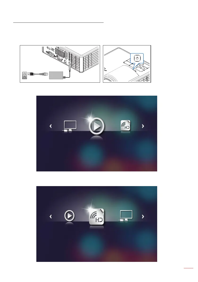 1. Connect the power cable with AC adapter and turn on the projector by pressing the