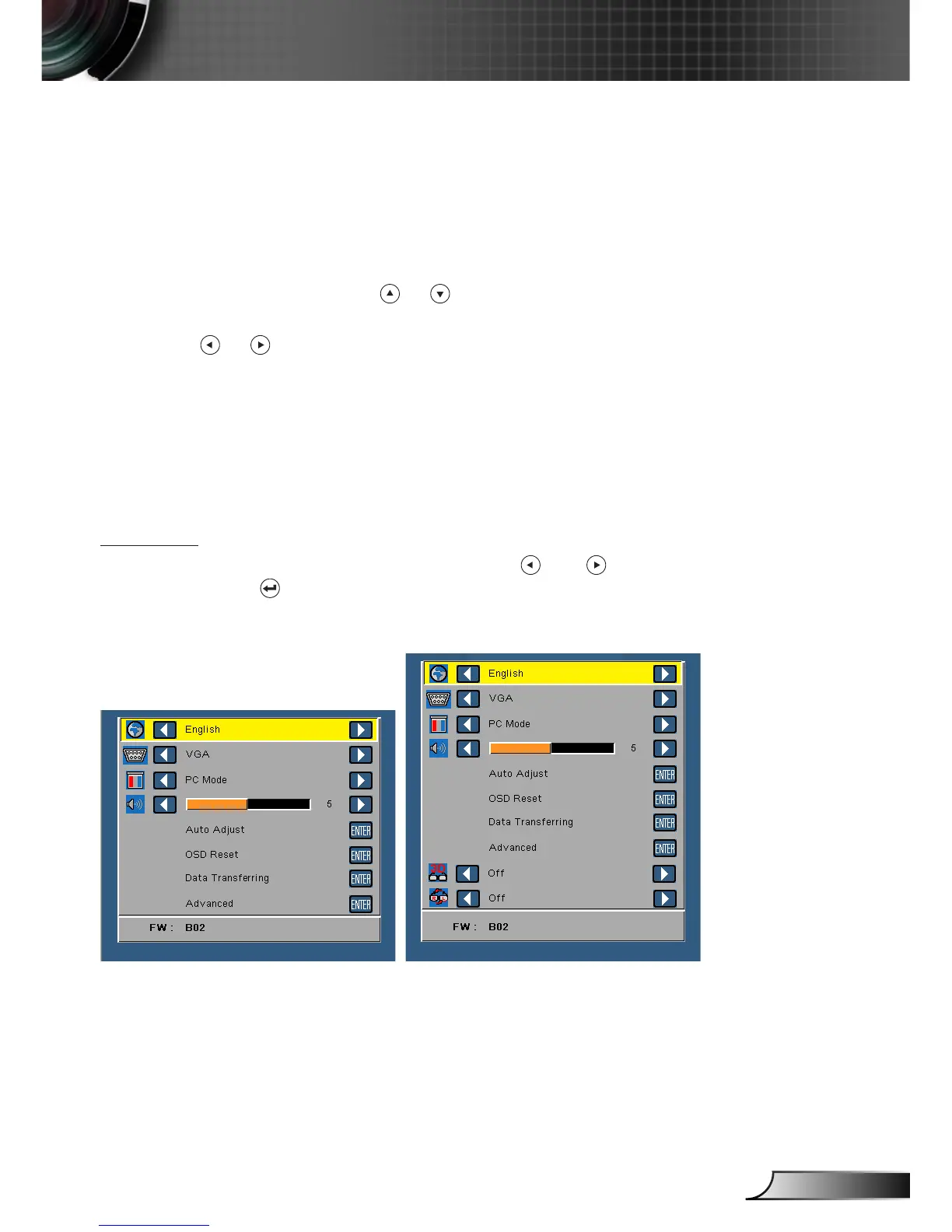 To select an option, press the 3. or buttons on your projector’s control panel or