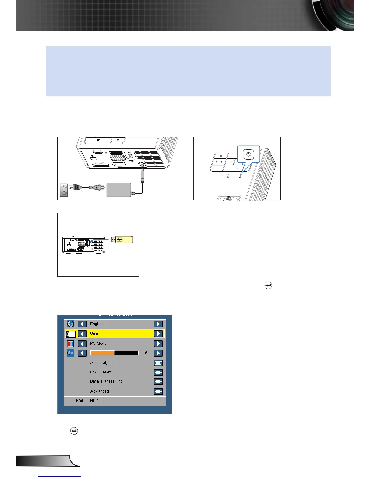 Connect the power cable with AC adapter and turn on the projector by pressing the 1.