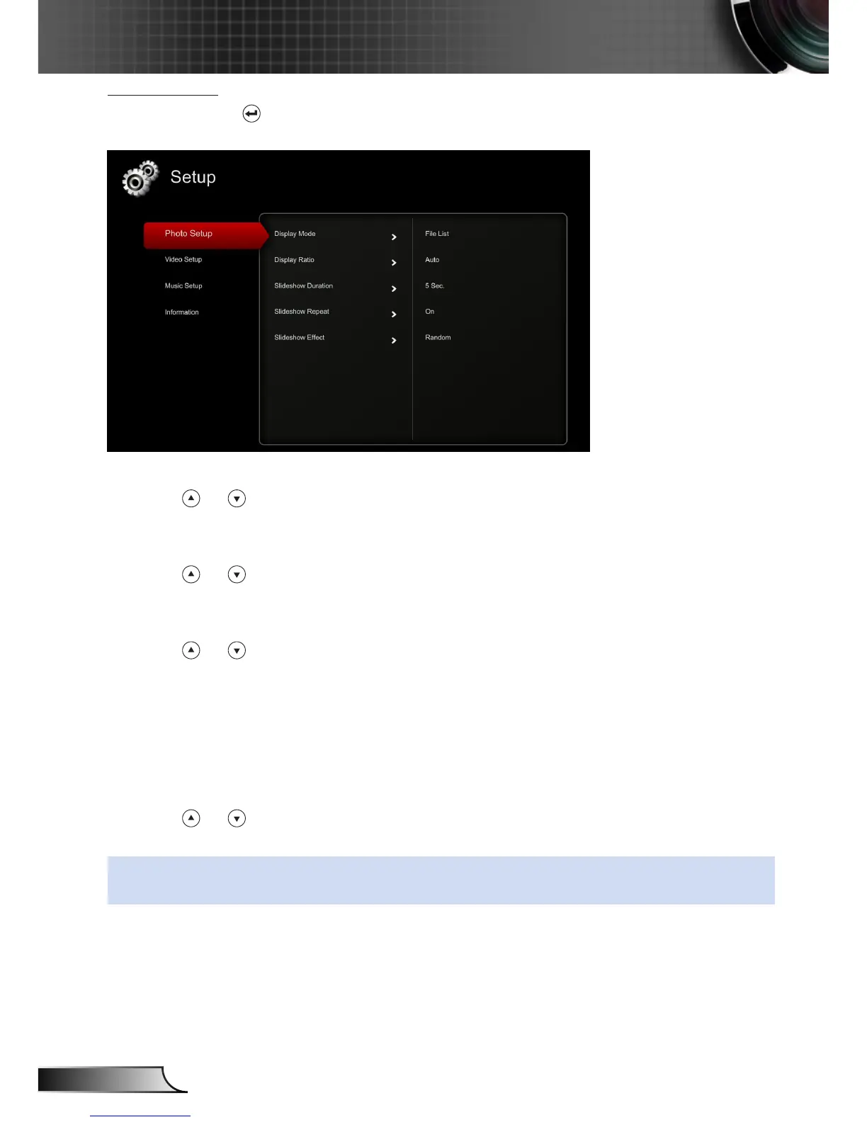 Select and press to activate photo setup menu. The photo setup menu provides the