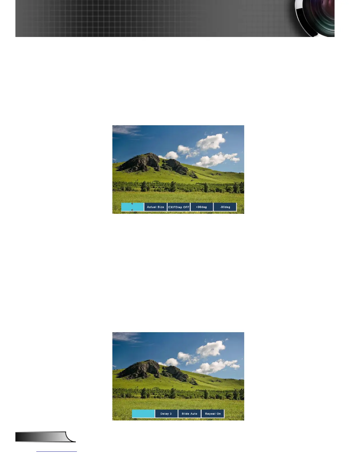 4. Press the SlideShow key to enter the Slide Show Mode. The fol-