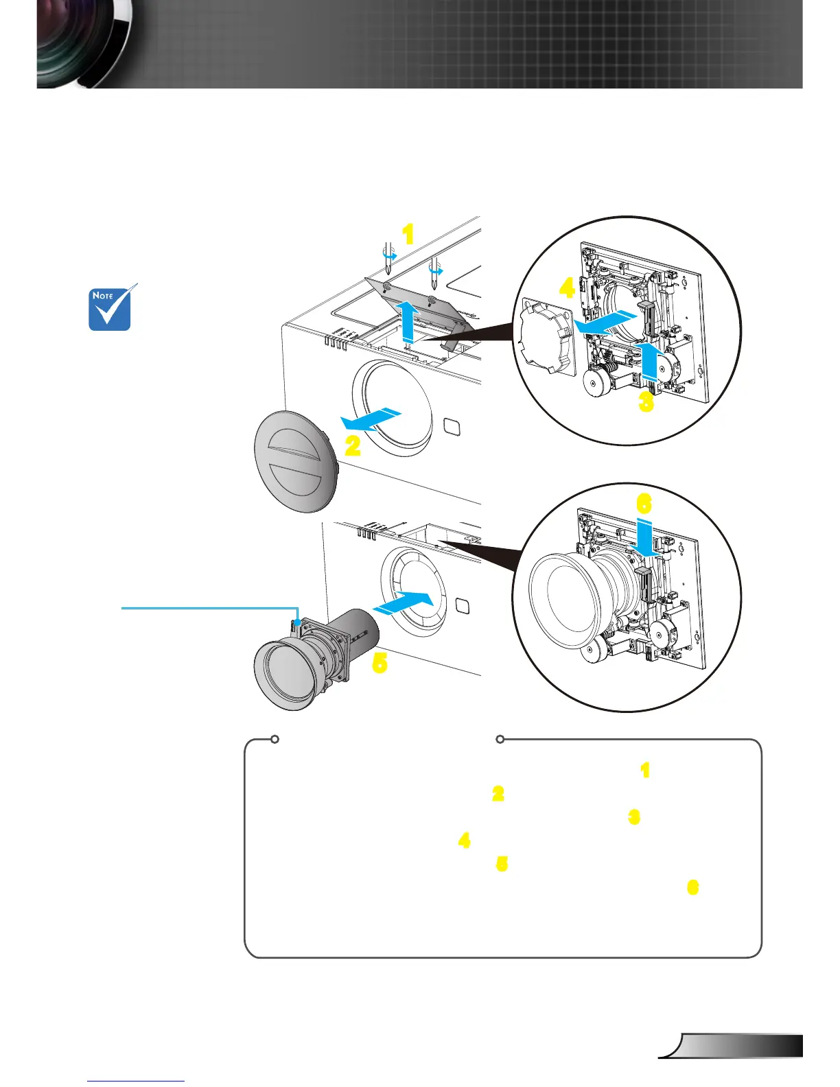 1. Unscrew the 2 screws and lift up the lens door. 1