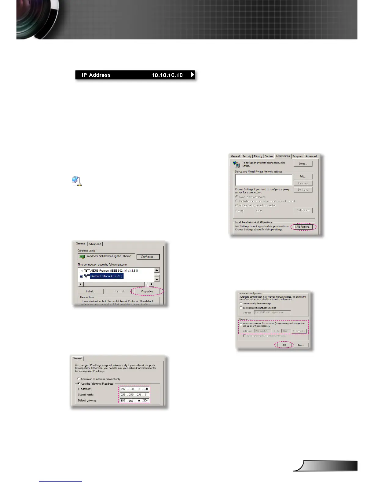 Step 1: Find an IP Address (192.168.0.100) from LAN function of projector.