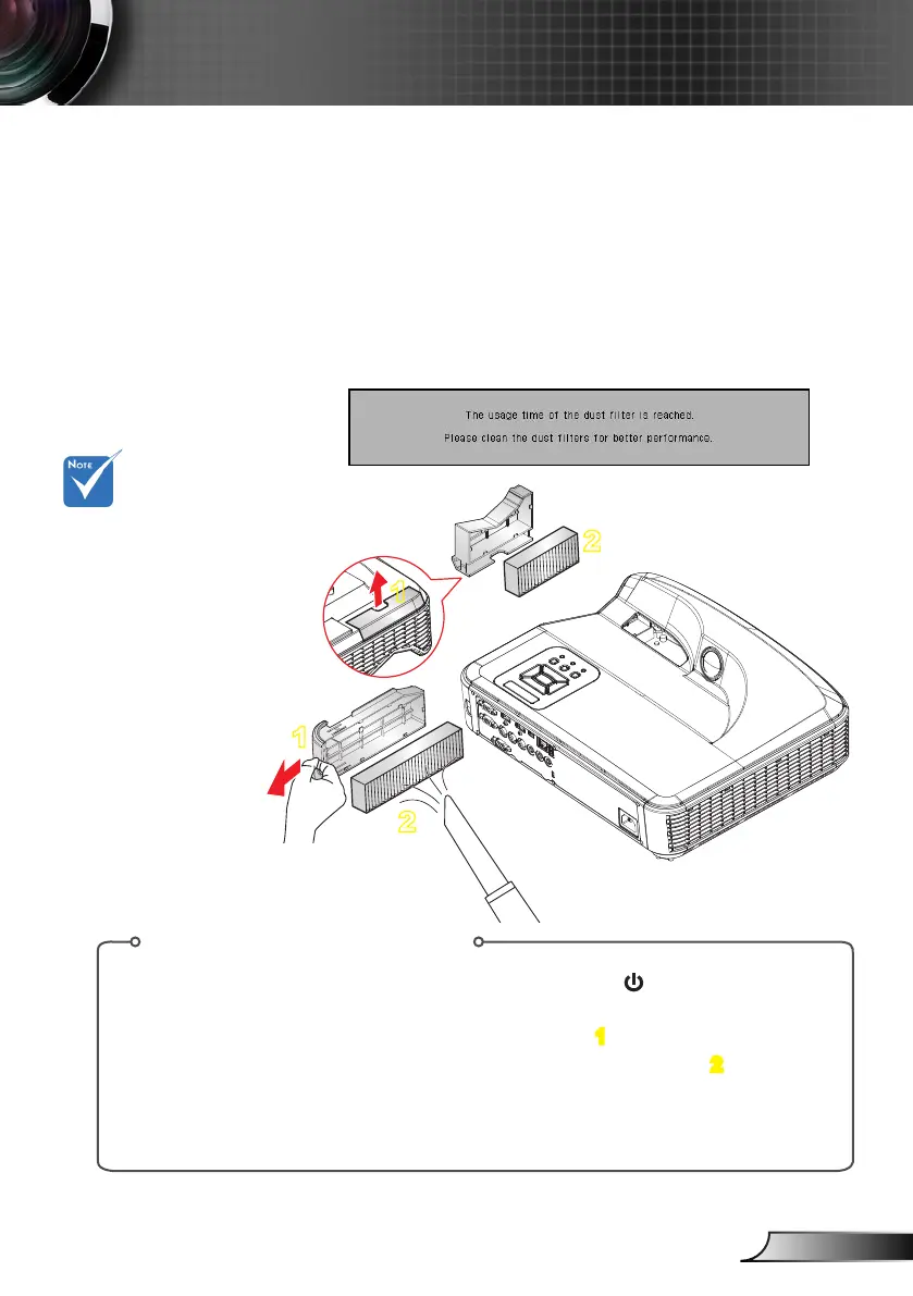 5. Turn on the projector and reset the lter usage counter after the dust lter is
