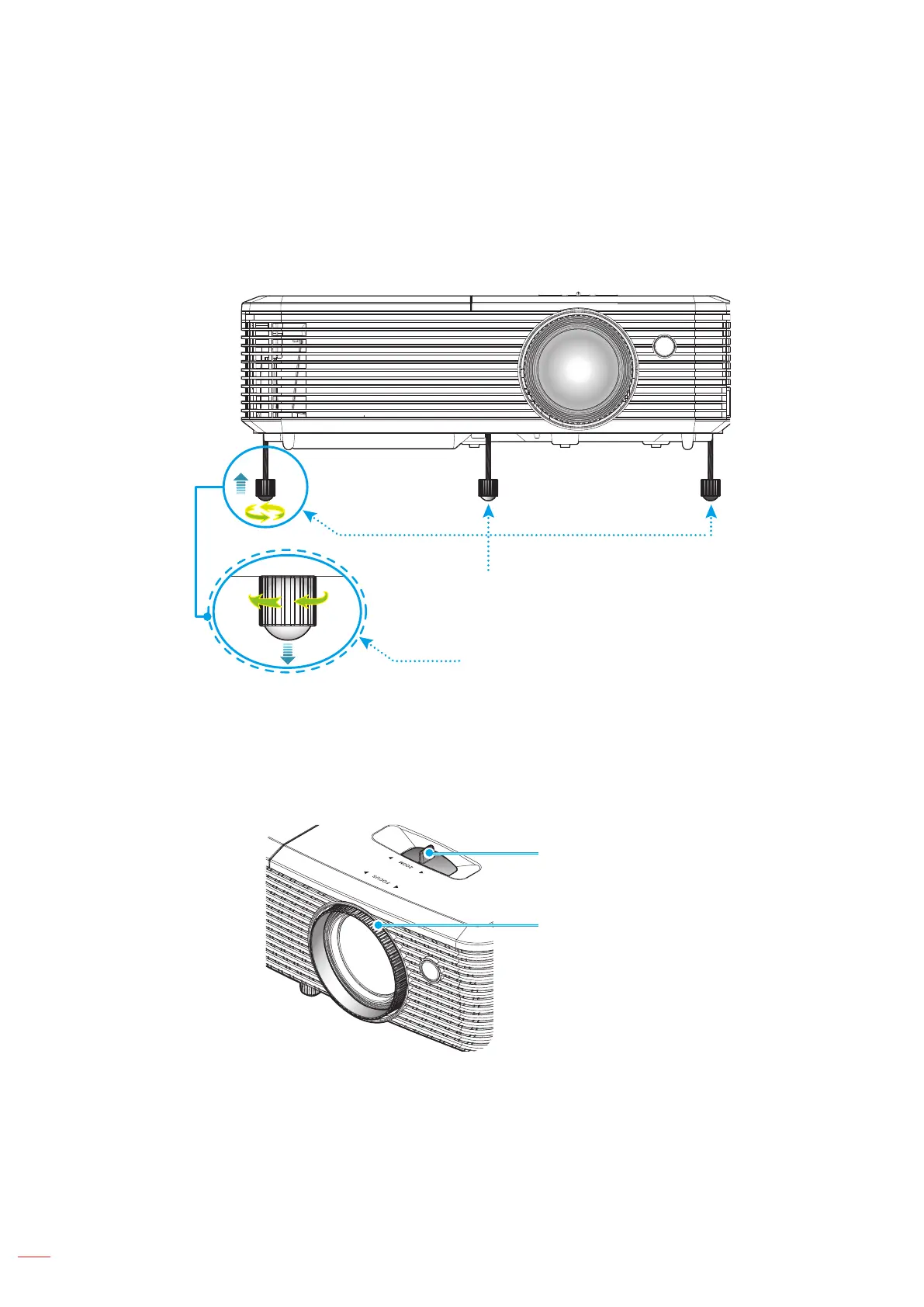 Rotate the adjustable foot clockwise or counterclockwise to raise or lower the projector.2.