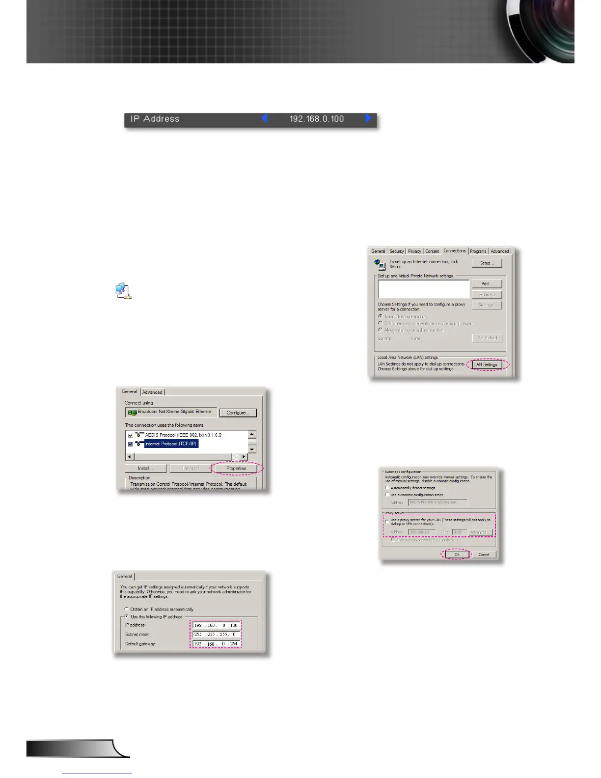 Step 1: Find an IP Address (192.168.0.100) from LAN function of projector.