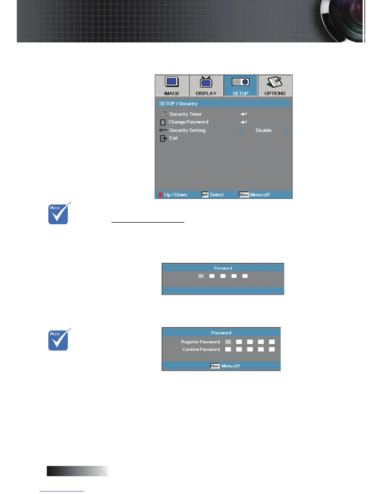 Use this submenu to change the security password for the projector.
