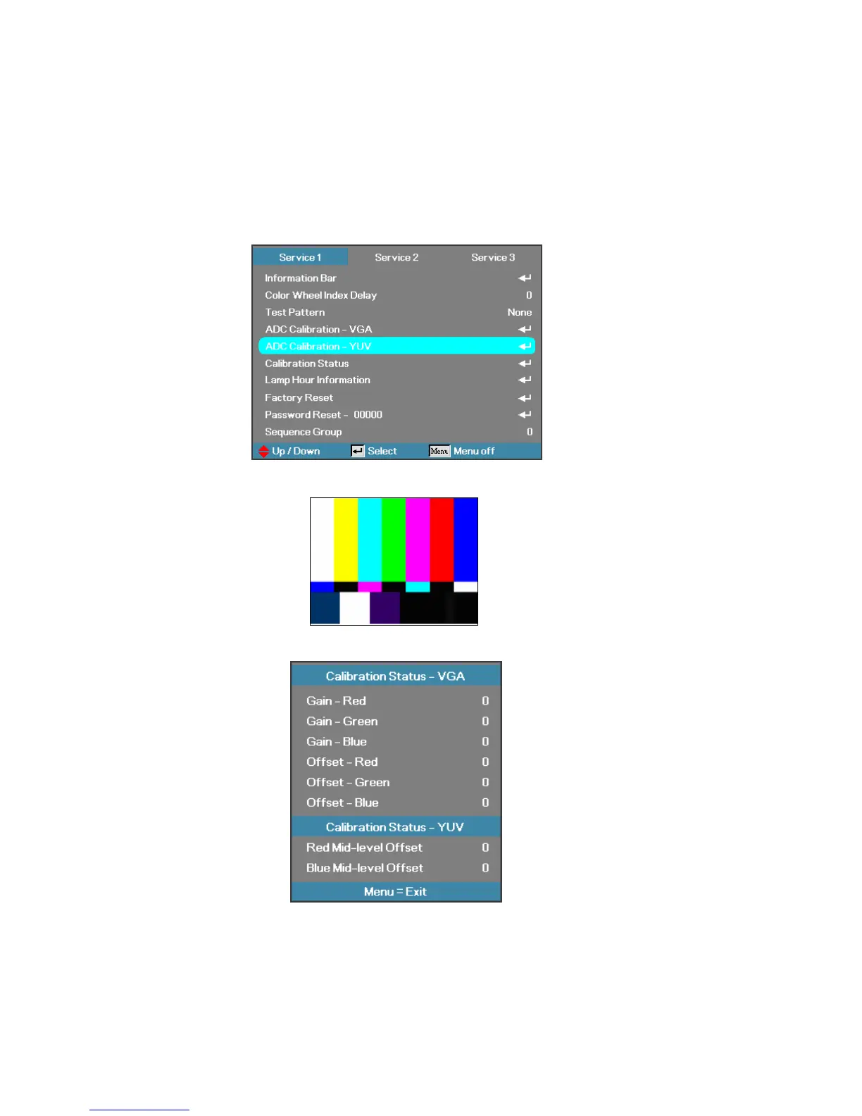 Step 1: In Service 1 Mode select ADC Calibration - YUV. In this menu input pattern with 75﹪SMPTE