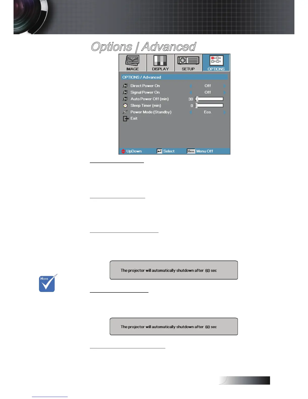 Set the Auto Power O interval. The projector powers o the lamp after