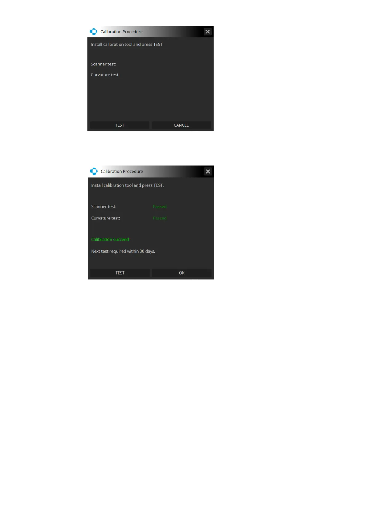 If the system passes calibration, the following message is displayed in the calibration window: