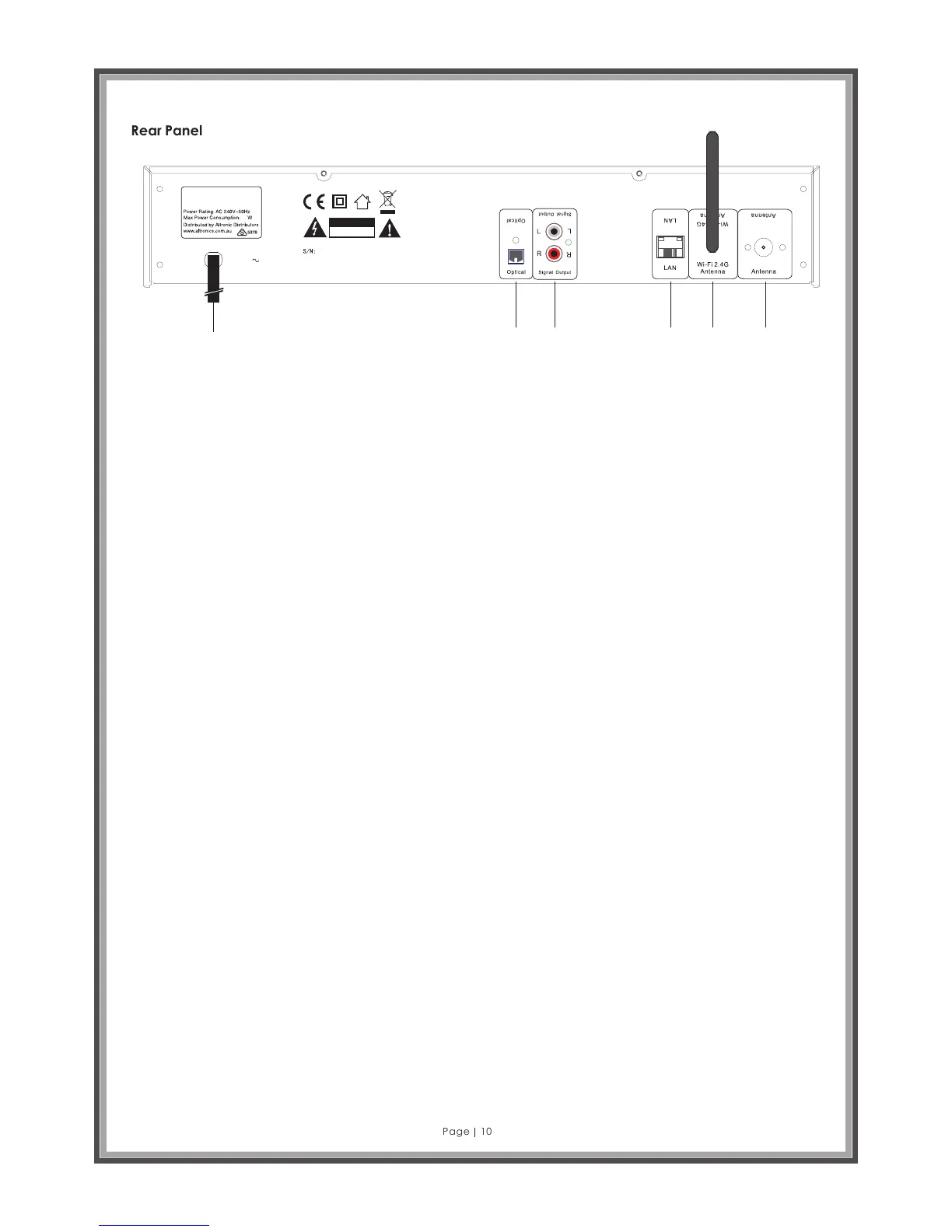 5. Wi-Fi 2.4G Antenna: WLAN 2.4 GHz Wi-Fi antenna input jack for internet radio (supplied).
