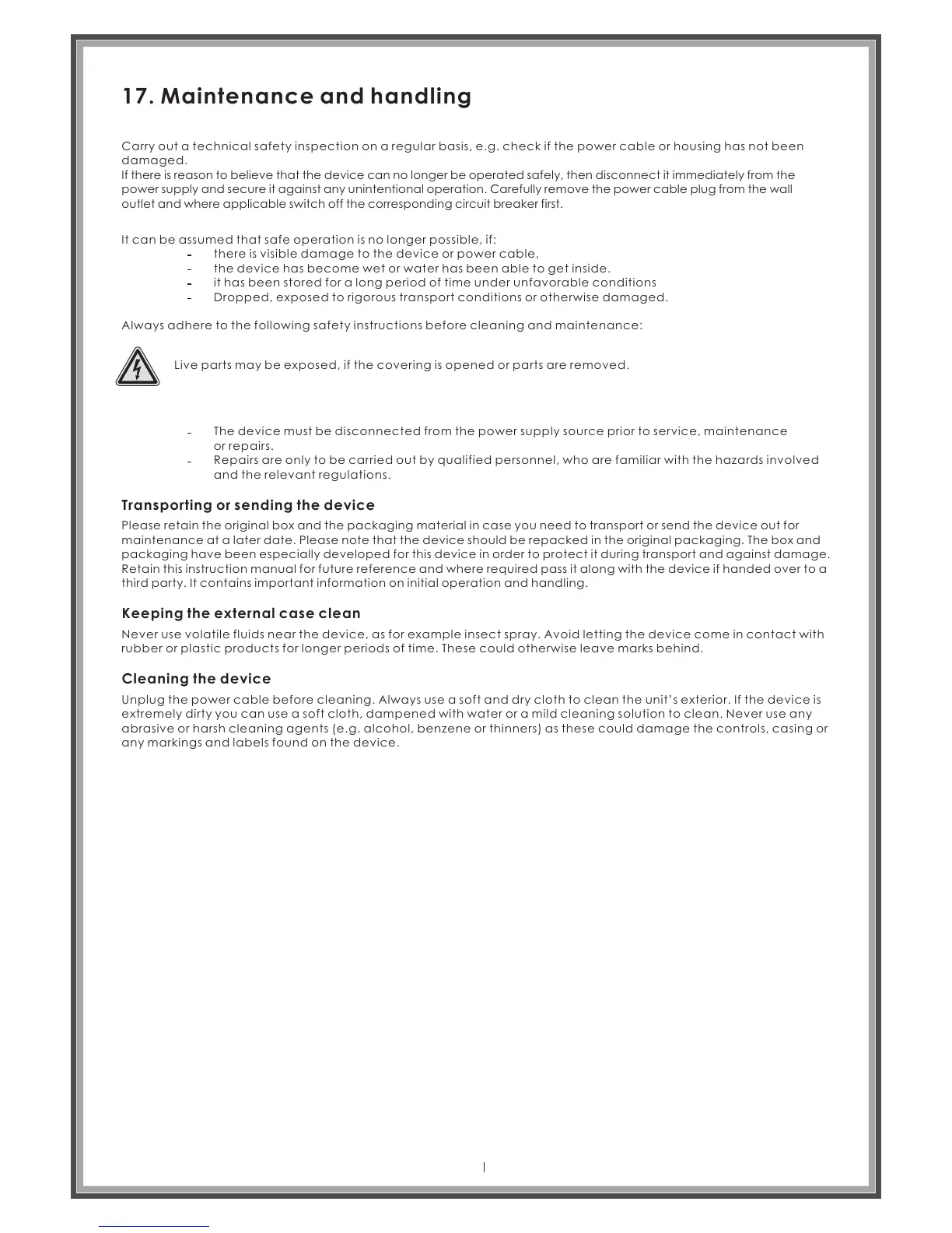 maintenance at a later date. Please note that the device should be repacked in the original packaging. The box and