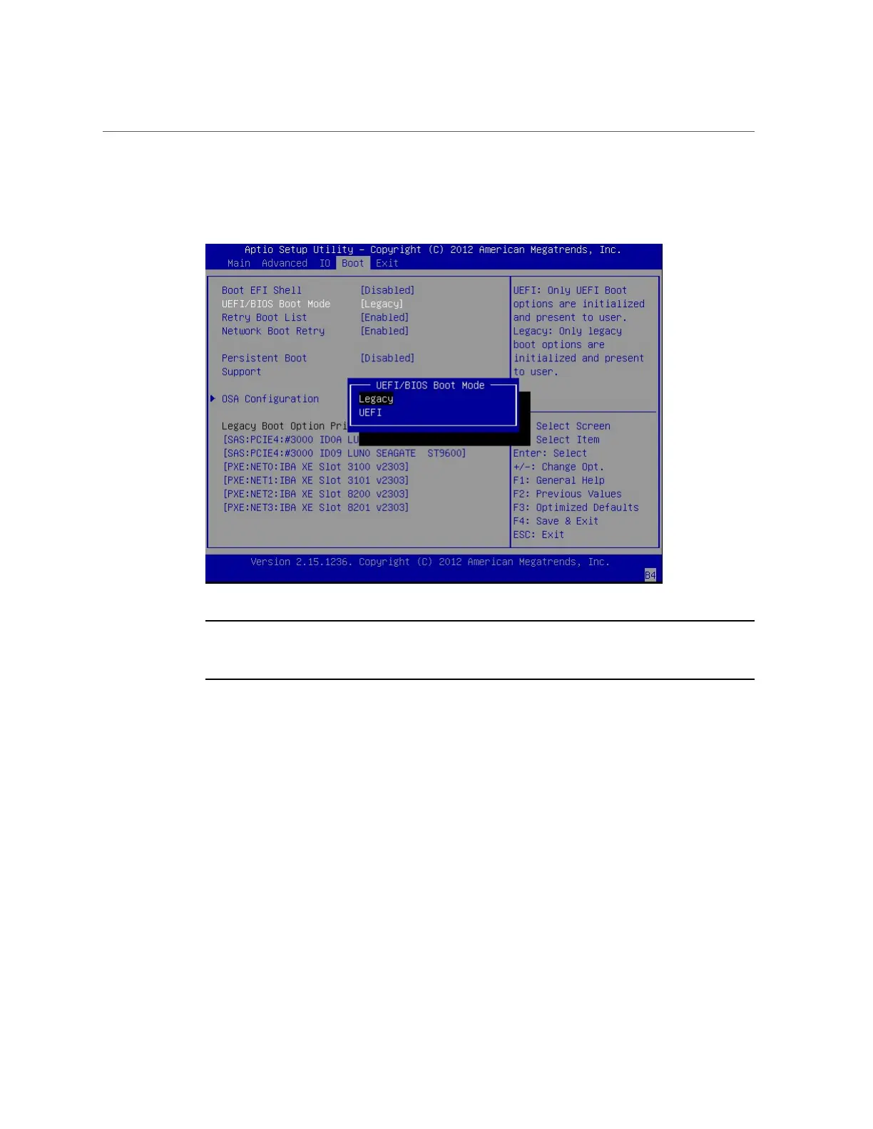 Use the up and down arrow keys to select the appropriate Legacy or UEFI mode,