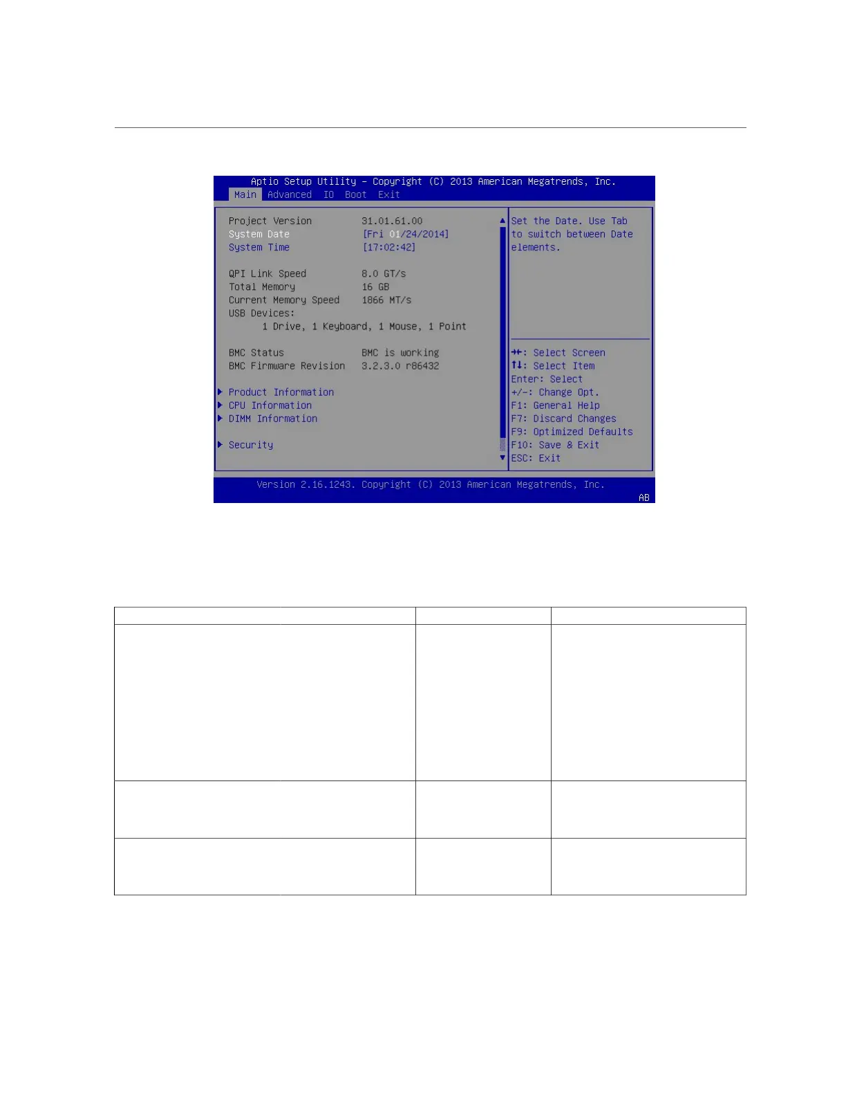 The following tables describe the options provided by the BIOS Main menu sub-menus.