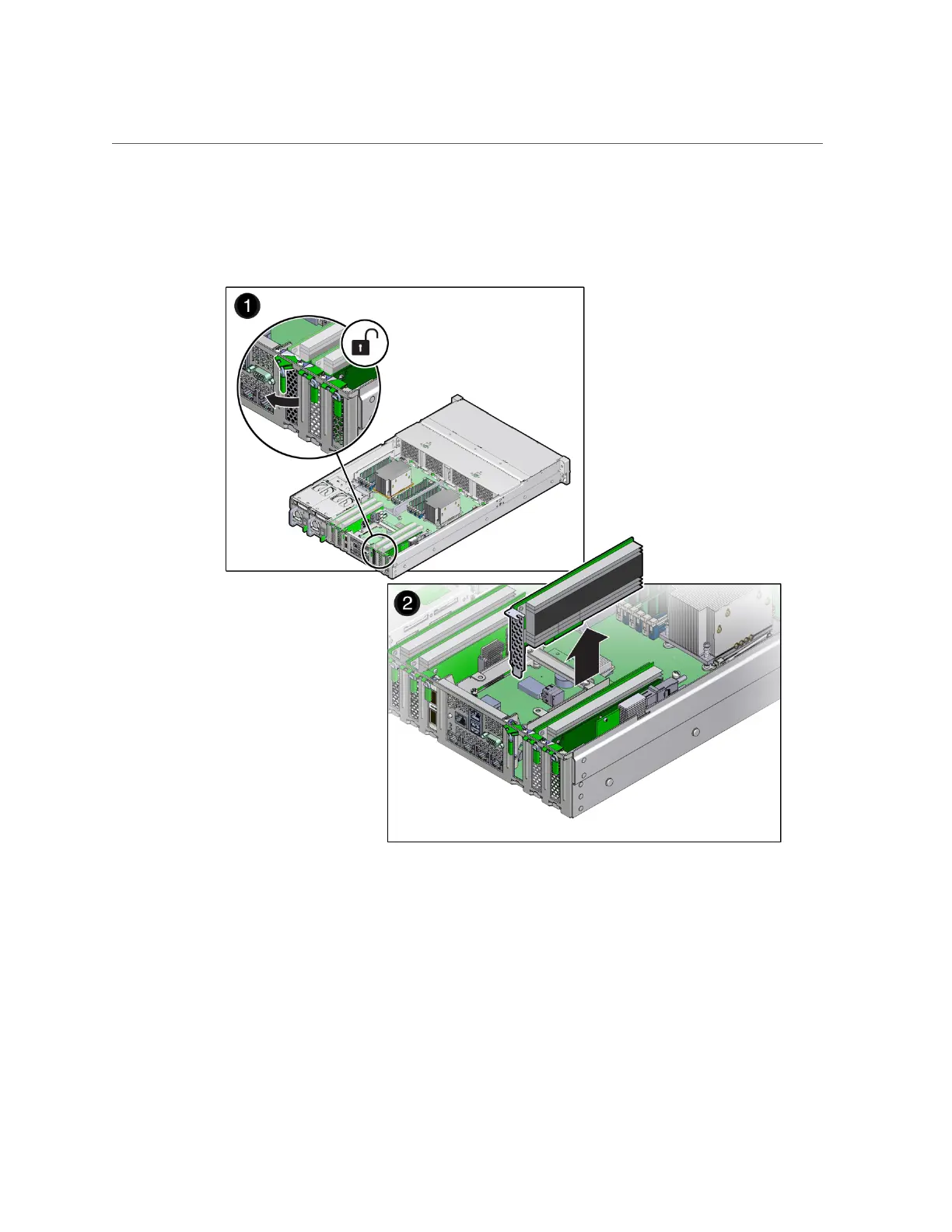 Rotate the PCIe card locking mechanism [1], and then lift up on the PCIe card to