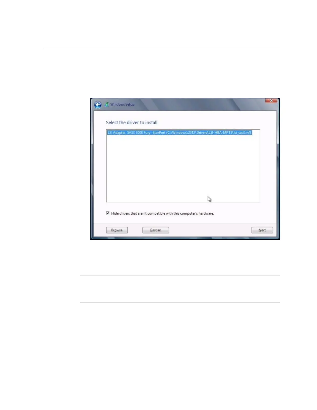 The selected driver appears in the Select the Driver to Install dialog.