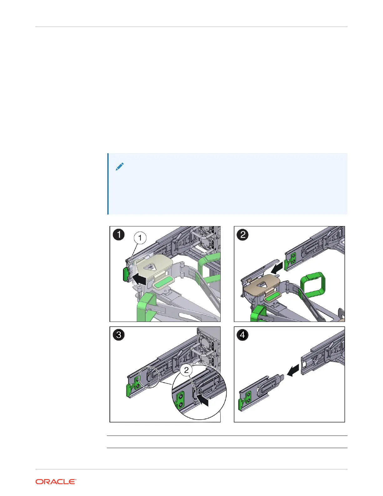 a. Press the green release tab (callout 1) on the slide rail latching bracket toward the left
