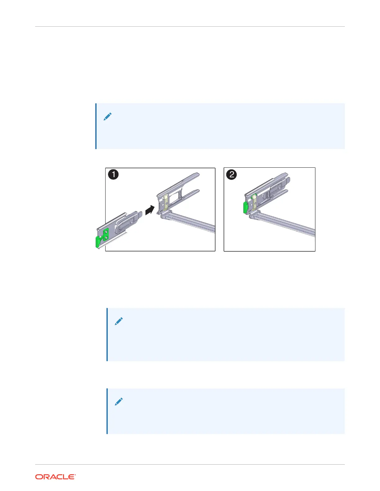 The slide rail latching bracket has a green release tab. Use the tab to release