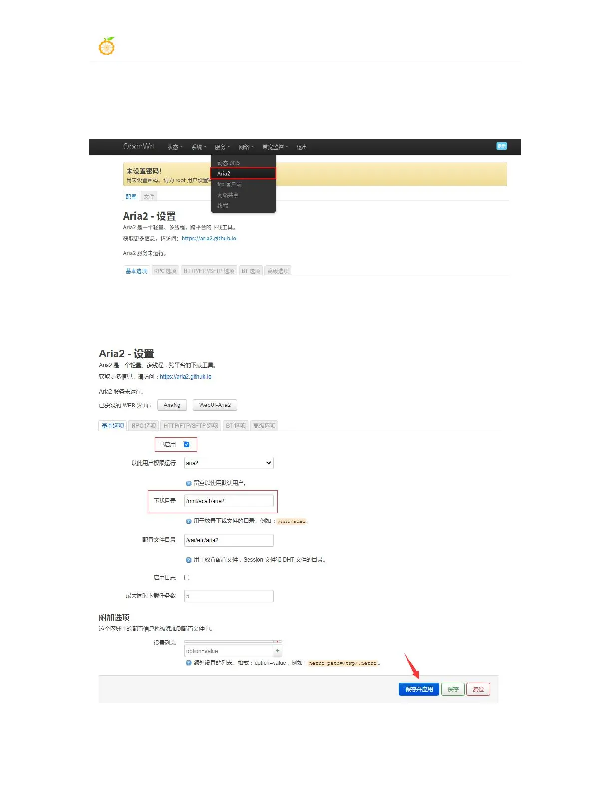 2) Check "Enabled" to enable Aira2, set the directory for downloading files in