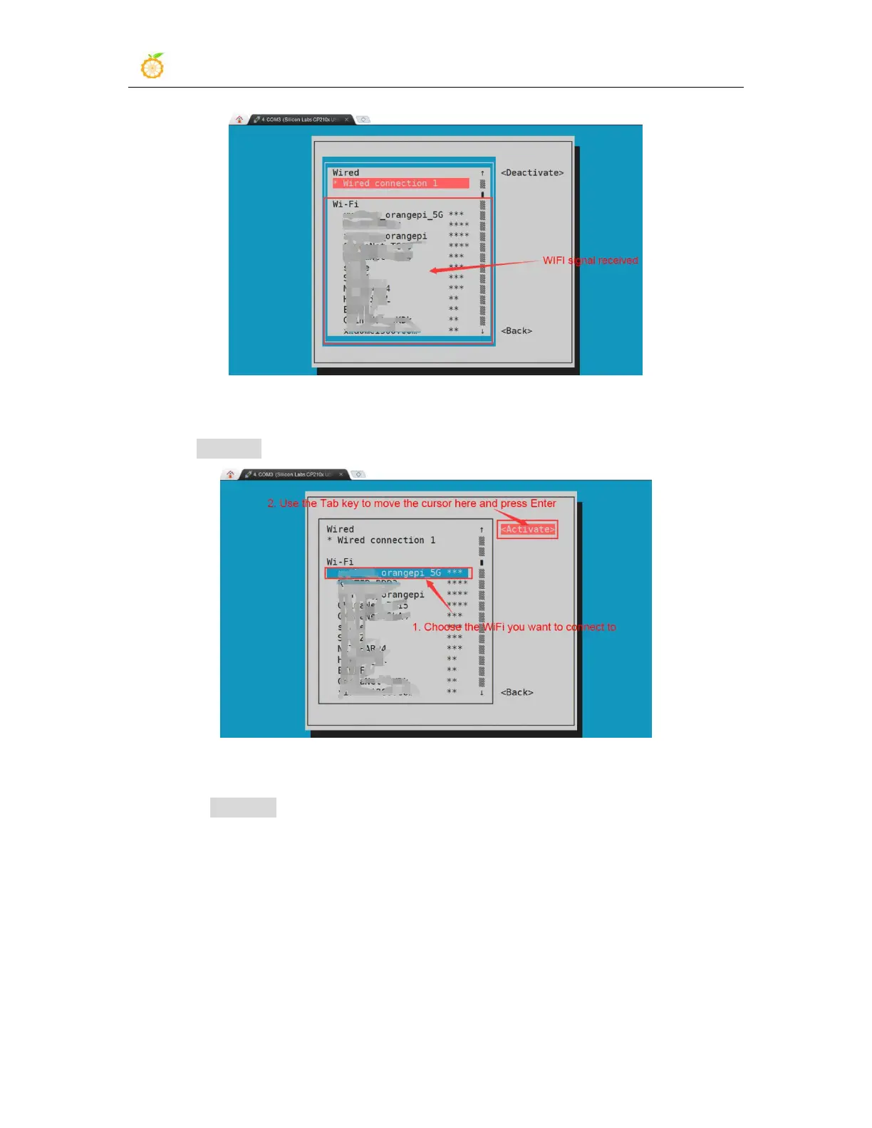6) Select the WIFI hotspot you want to connect to, then use the Tab key to position the