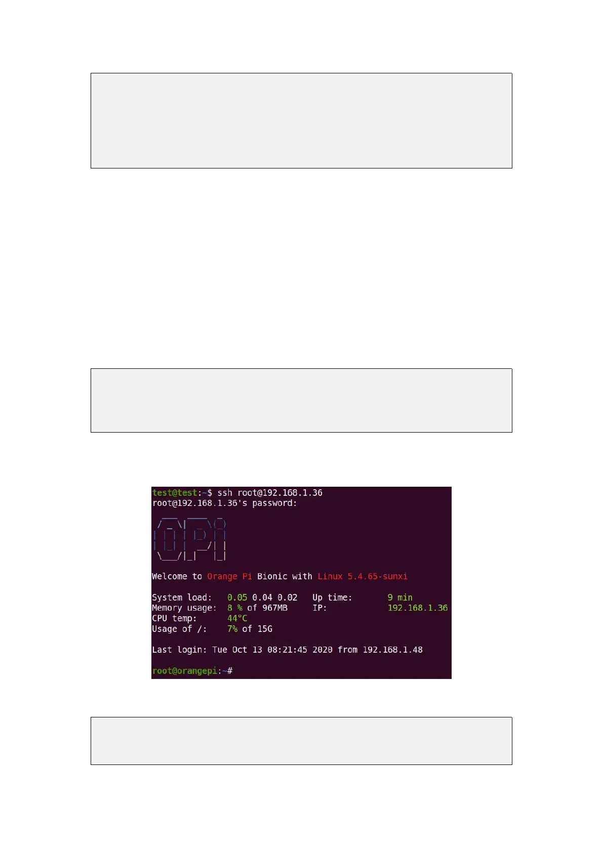 test@test:~$ ssh root@192.168.1.36 (Need to be replaced with the IP address