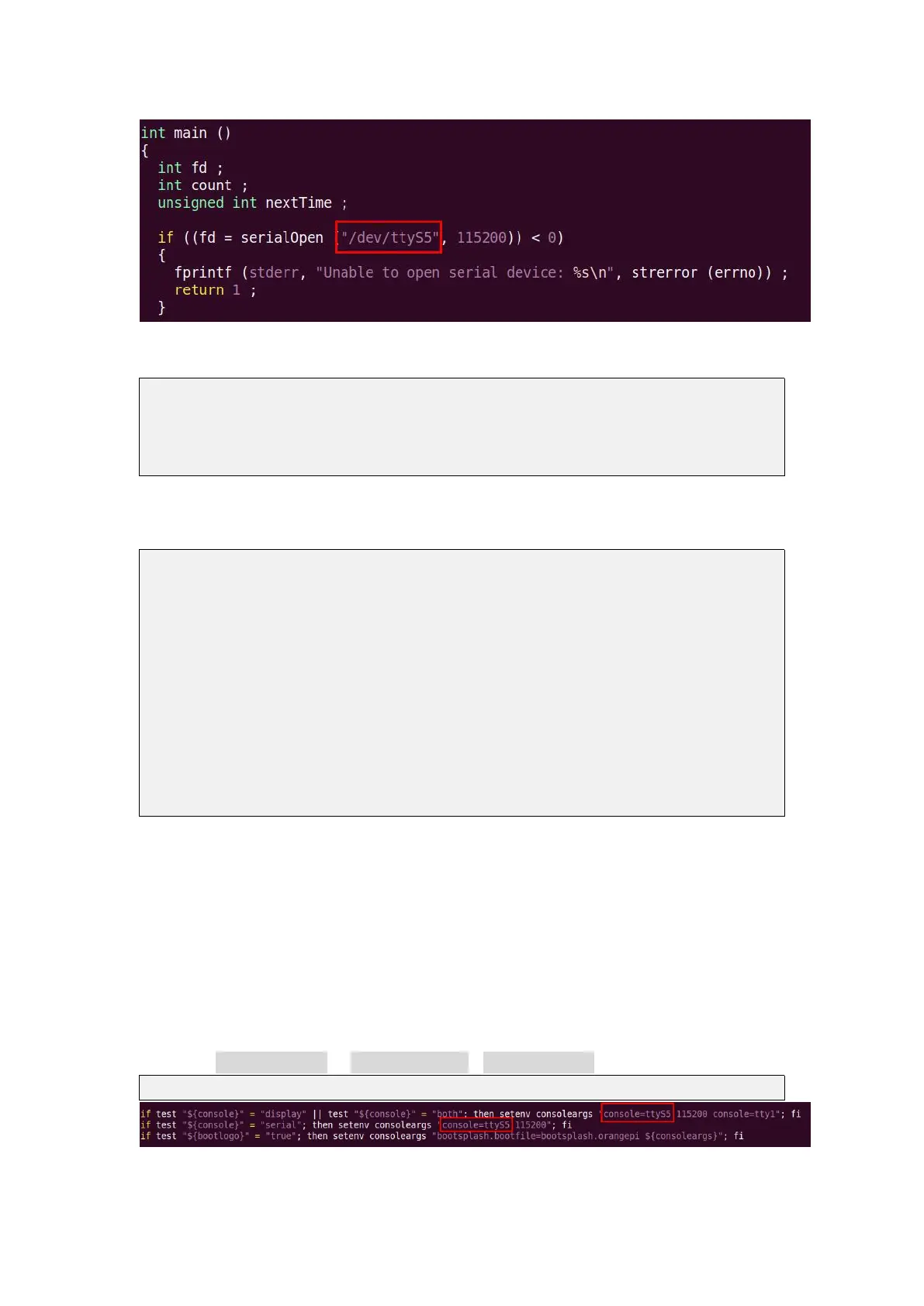 1) Modify console=ttyS0 in /boot/boot.cmd to console=ttyS5