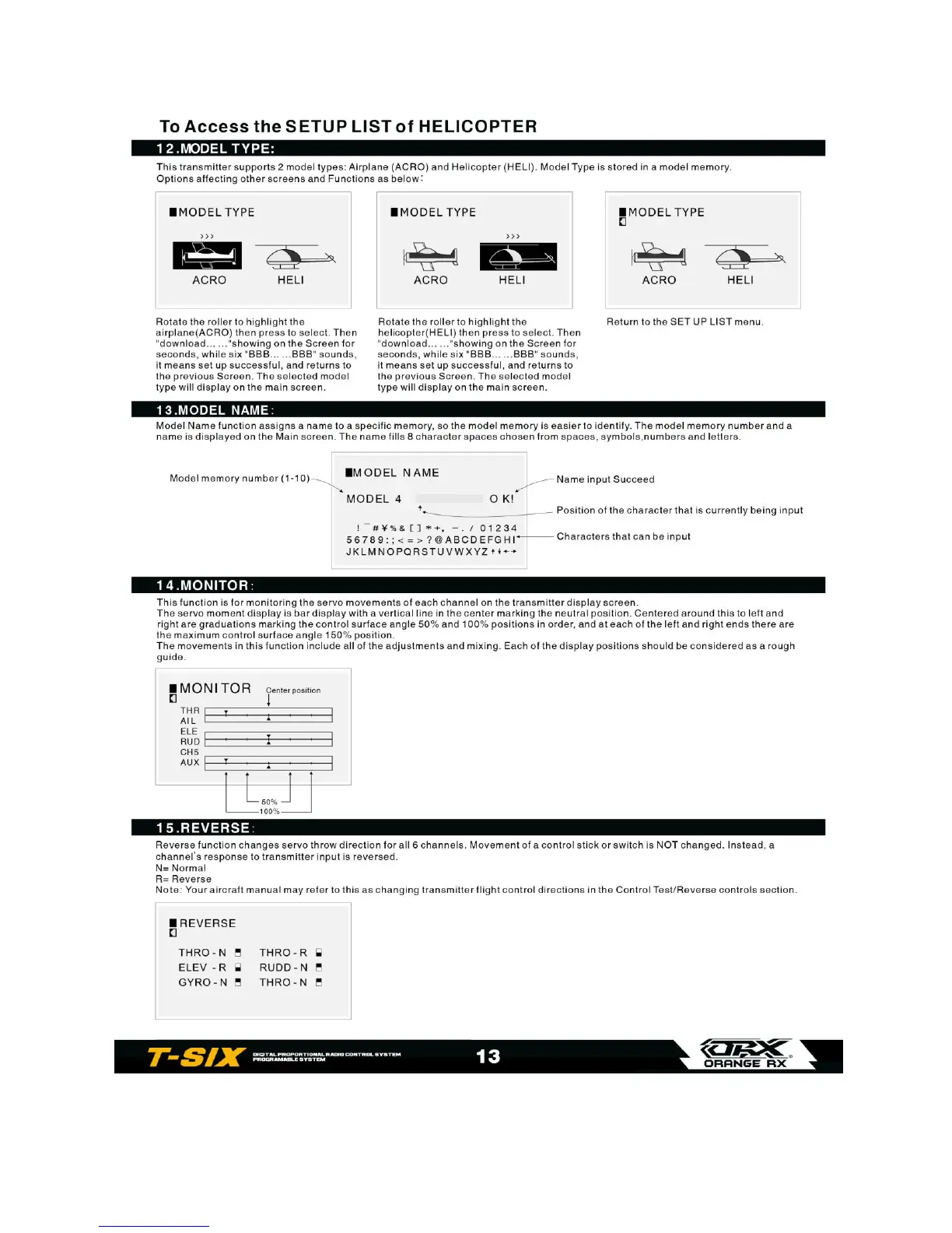 Orange RX T-SIX - Helicopter Setup List Options