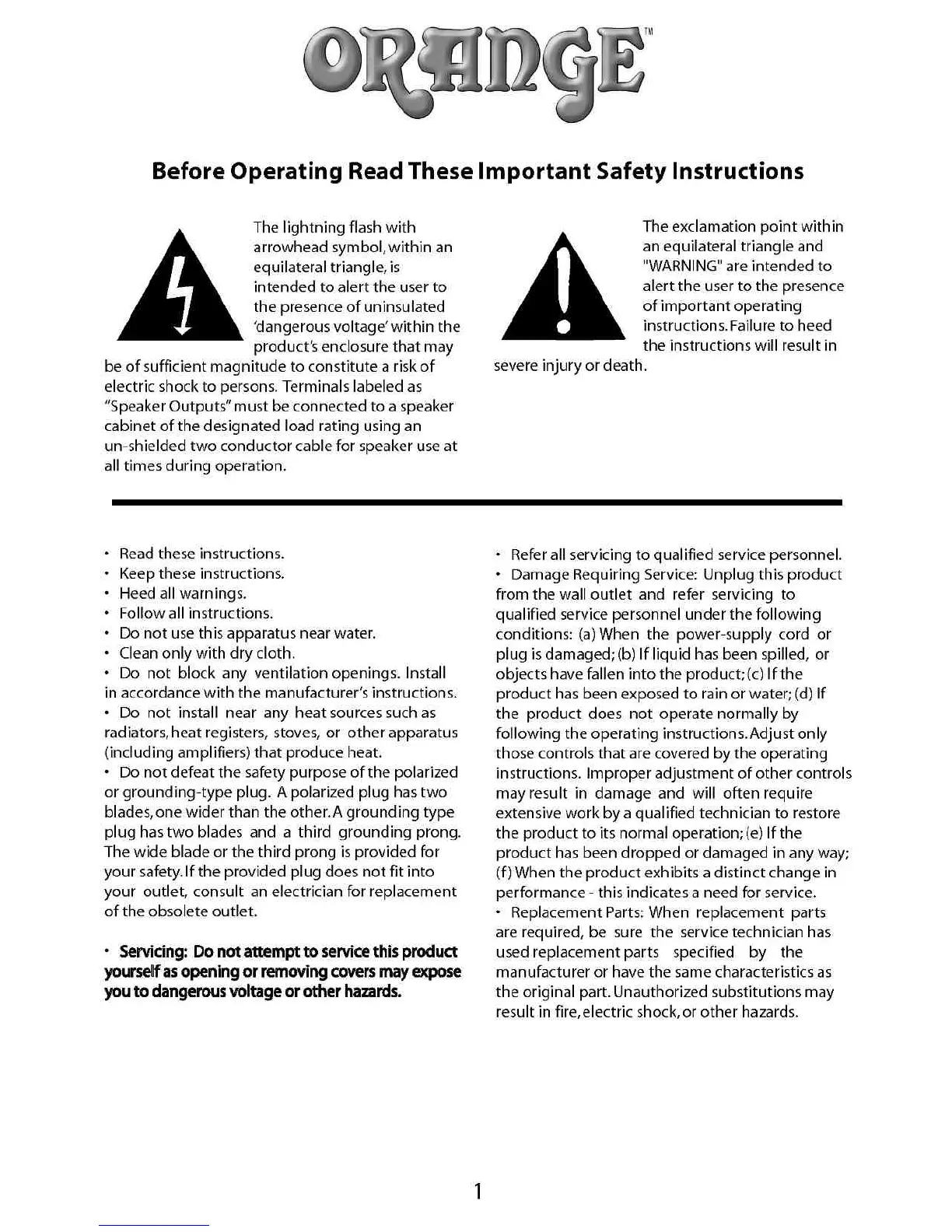 ORANGE Thunderverb - Important Safety Instructions; Electrical Hazard Warnings; General Operational Safety Rules