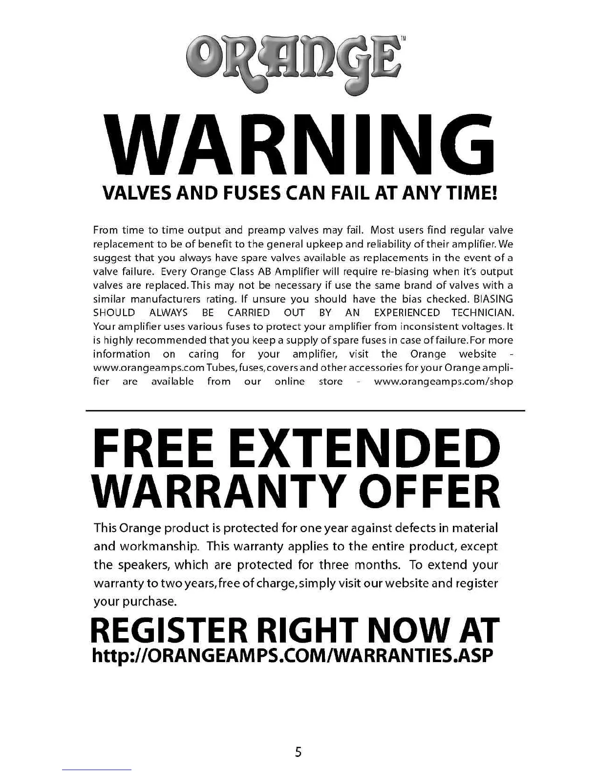 ORANGE Thunderverb - Valve and Fuse Maintenance; Failure Warnings and Recommendations; Free Extended Warranty Offer