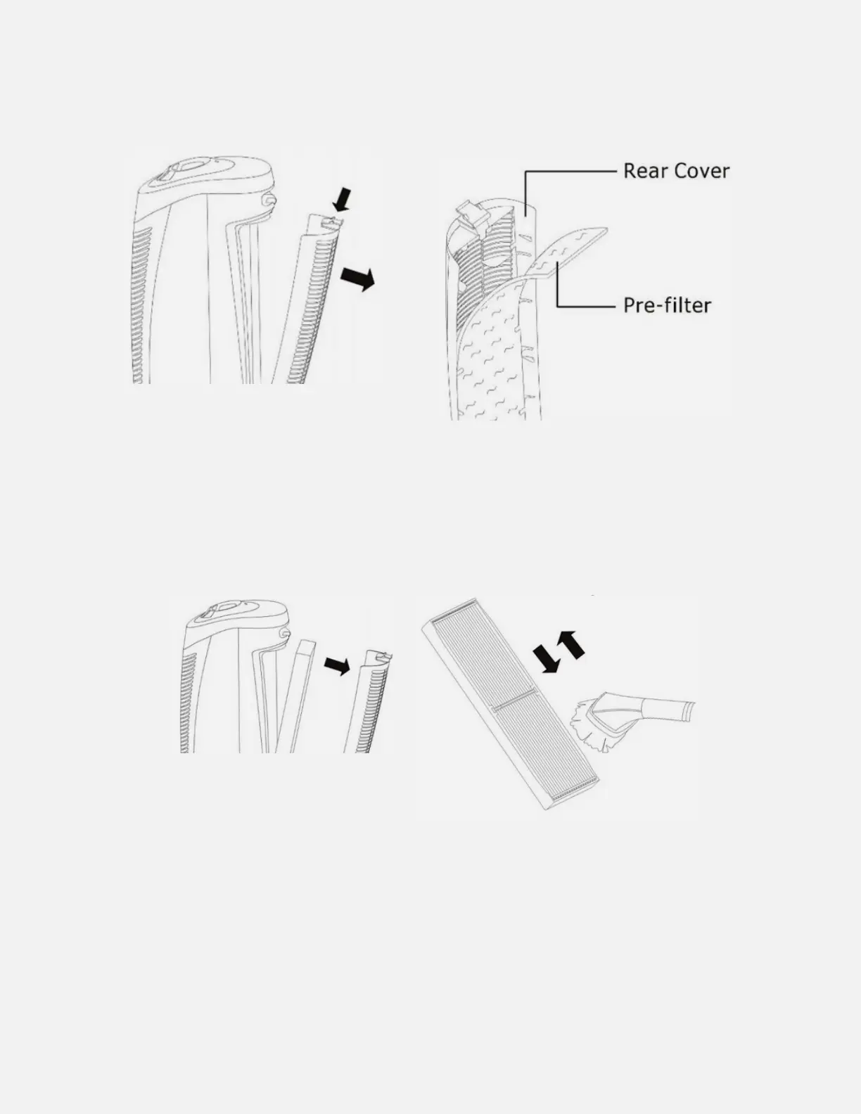 Remove the pre-filter from the rear cover. Clean the pre-filter with the vacuum