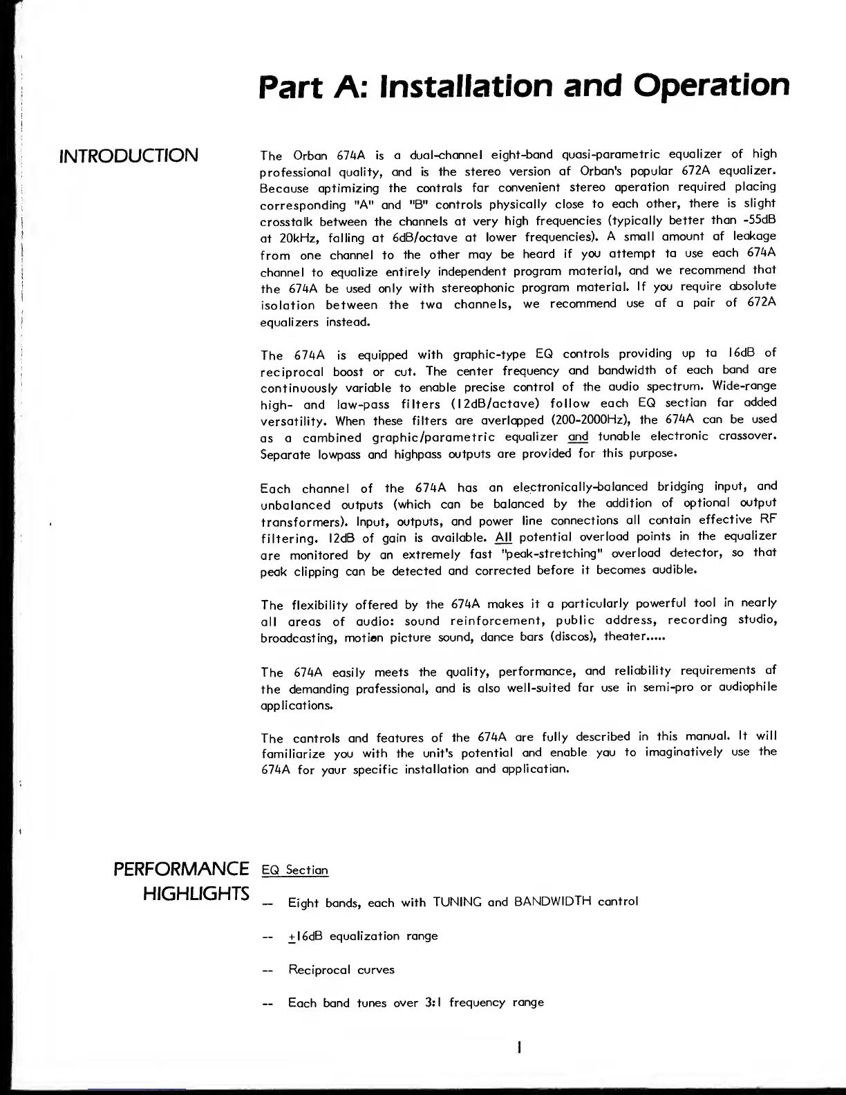 Orban 674A - Part A Installation and Operation; Introduction to the 674 A; Key Performance Features