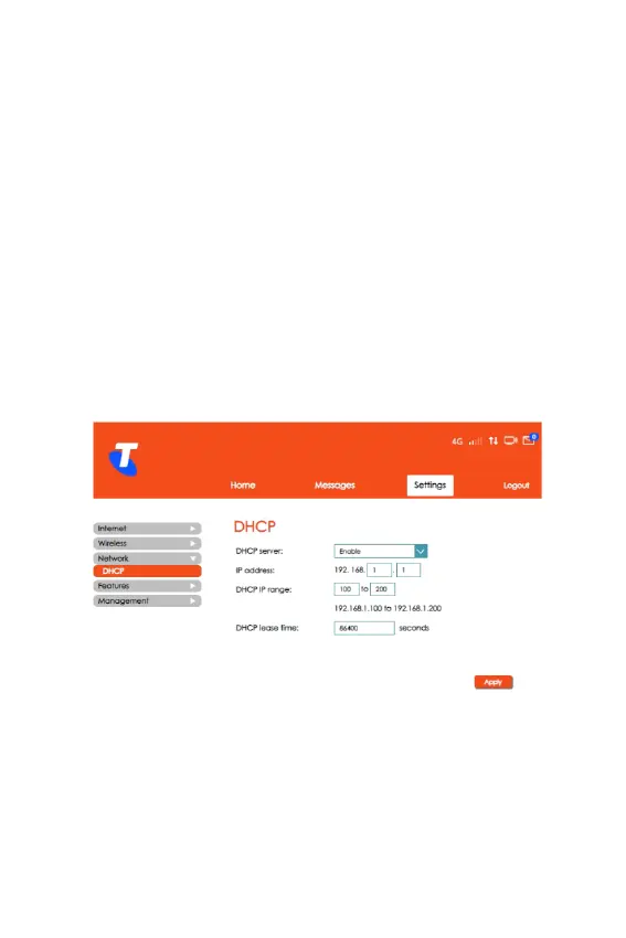 • In this section you can congure DHCP settings. The default