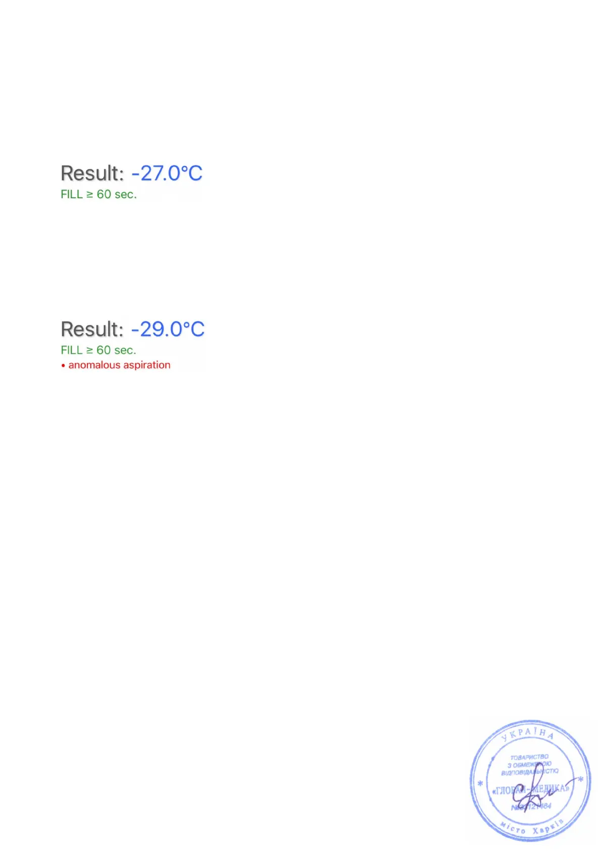 the “anomalous aspiration” warning. The reported CFPP result should be -29 ºC,