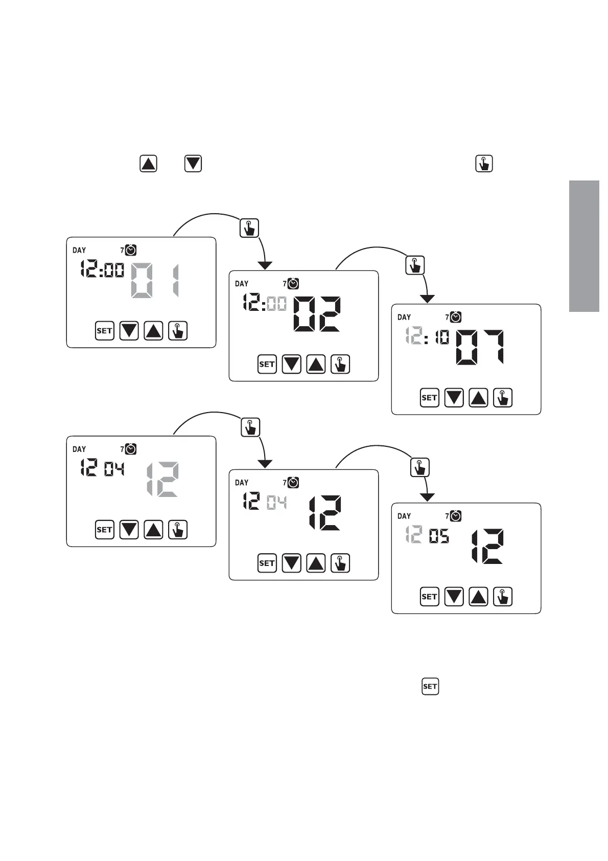 seconds (only synchronisation at value 00), minutes, hours, year, month, day.