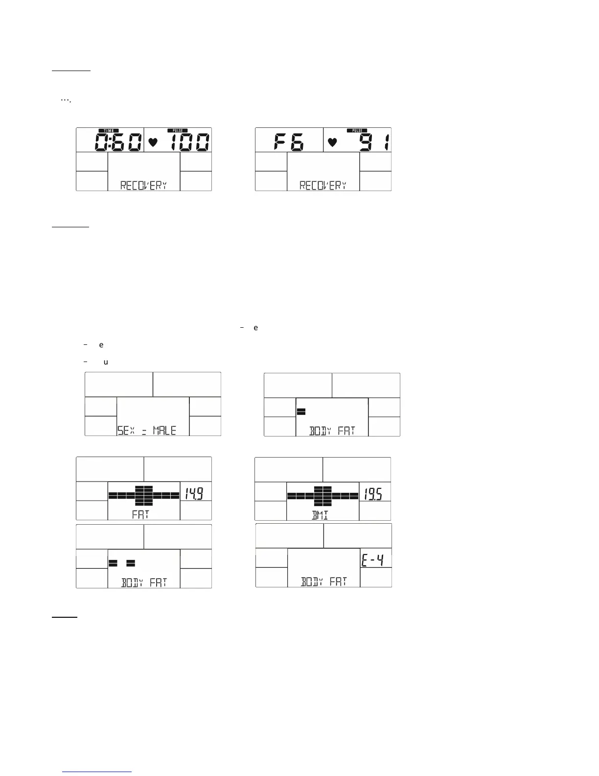 After exercising for a period, keep holding on hand grips or wearing chest strap and press RECOVERY key. All function display will stop