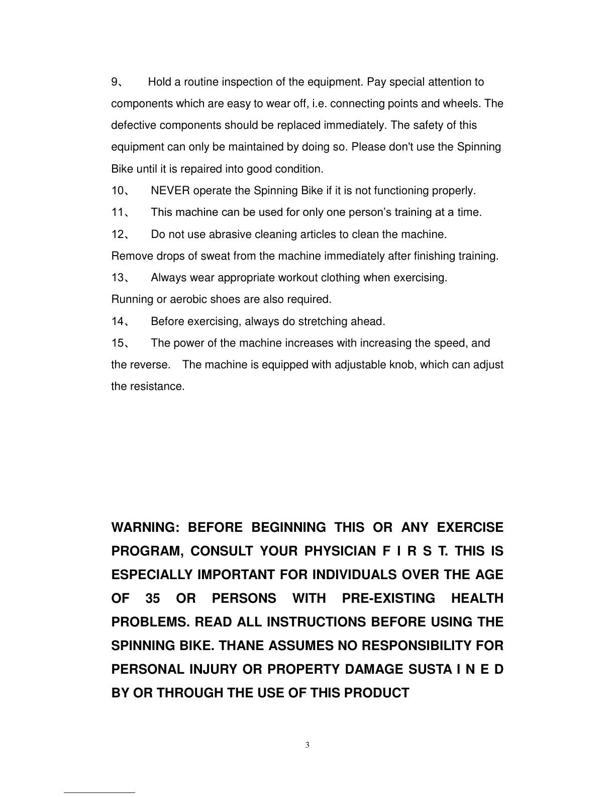SPINNING BIKE. THANE ASSUMES NO RESPONSIBILITY FOR