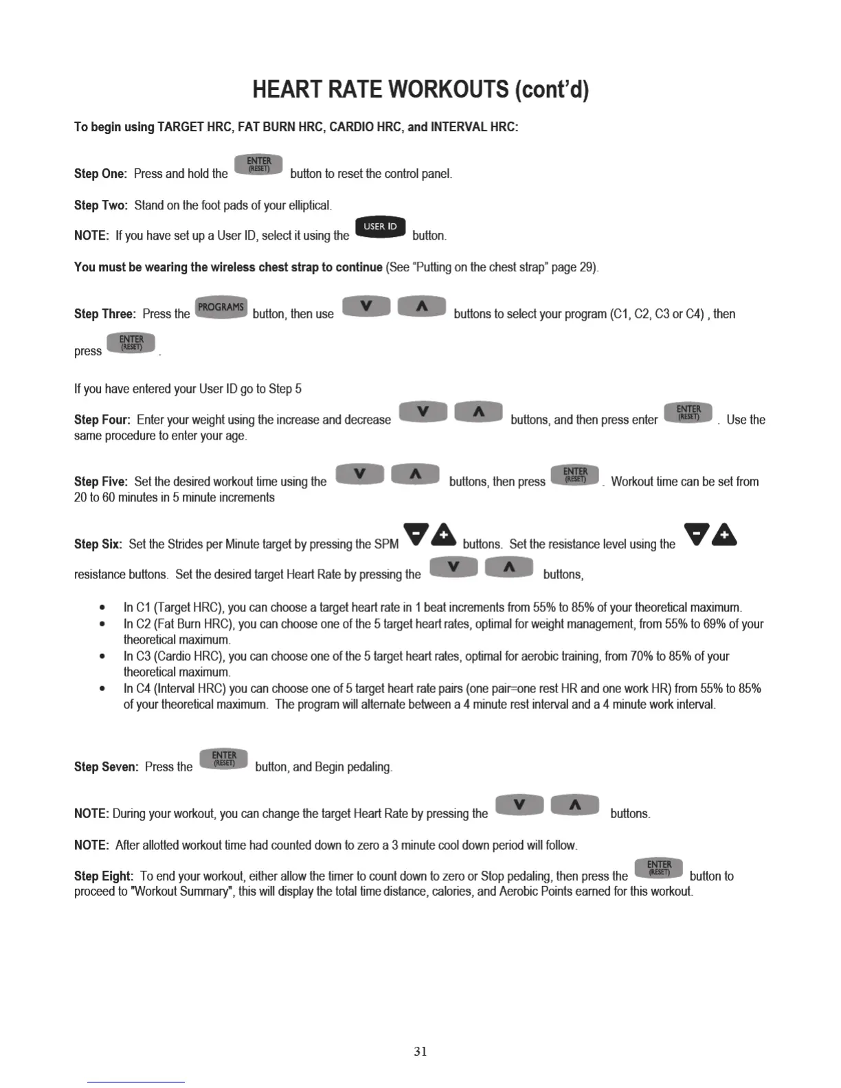 Orbit Silver XT - Heart Rate Workouts Setup (Continued); Target HRC, Fat Burn HRC, Cardio HRC Setup; Interval HRC Workout Setup