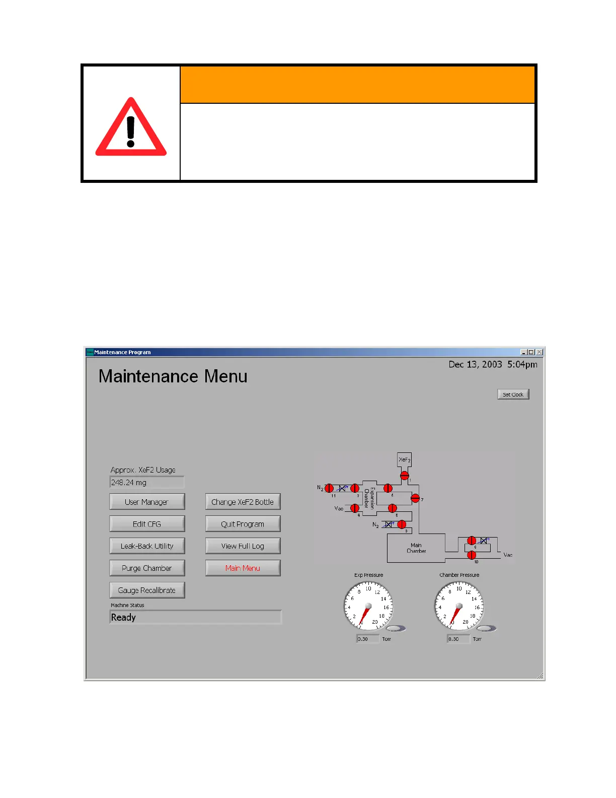 gauge recalibrating, changing the xenon difluoride bottles (see page 85), exiting the e1 Series software,