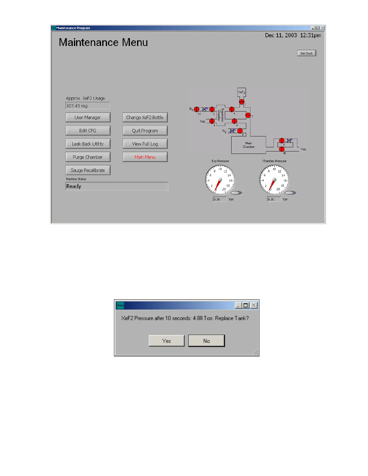 to the maintenance menu. If the pressure is below approximately 2 Torr, click YES, and the bottle
