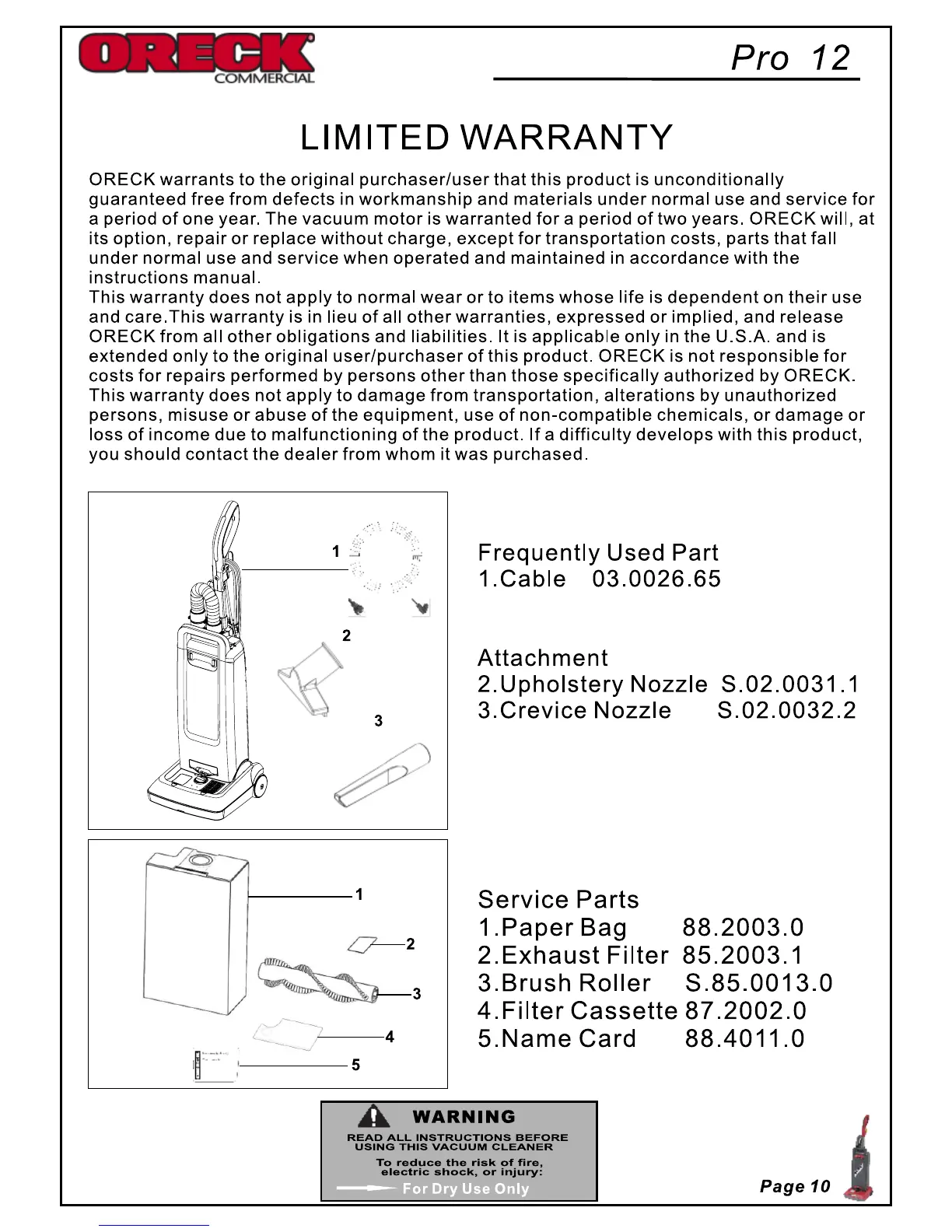 Oreck Pro12 - Frequently Used Part; Array