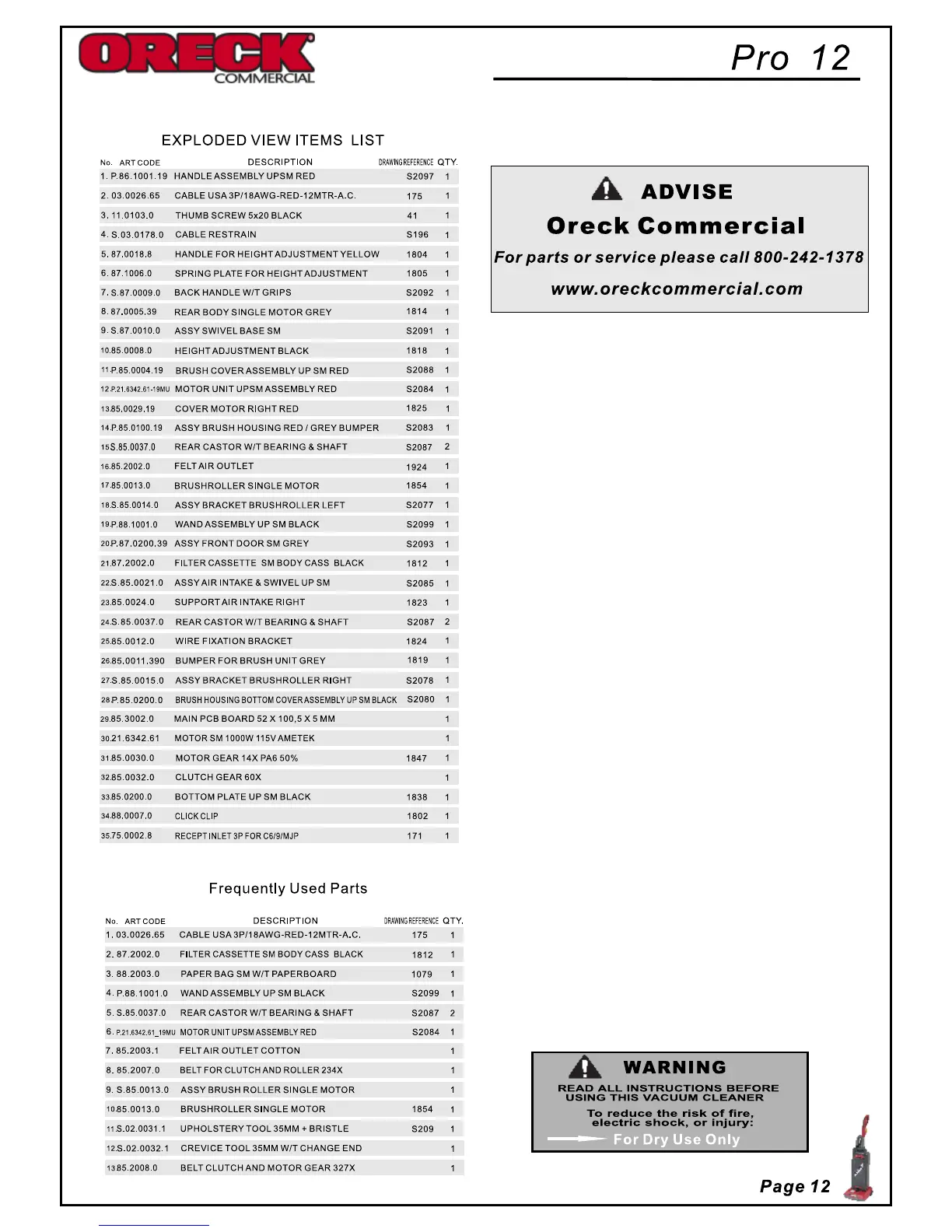 Oreck Pro12 - Exploded View Items List