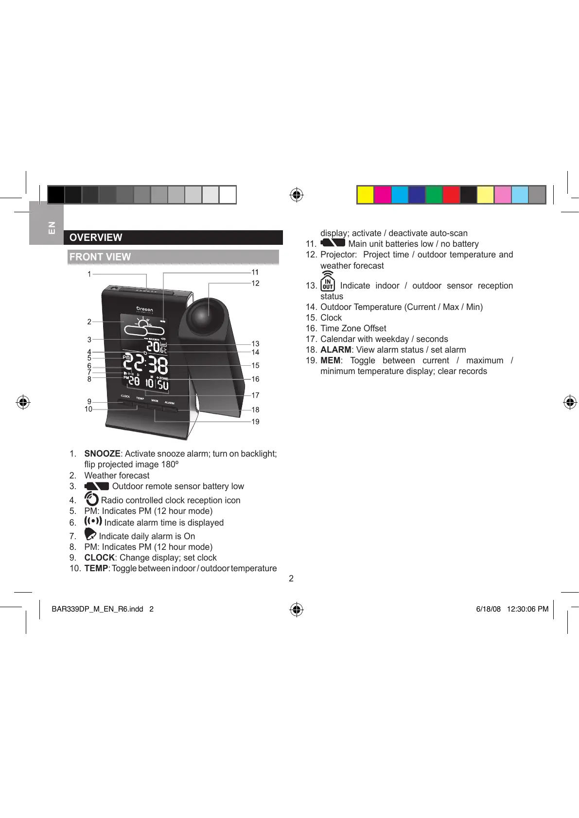 10. TEMP: Toggle between indoor / outdoor temperature