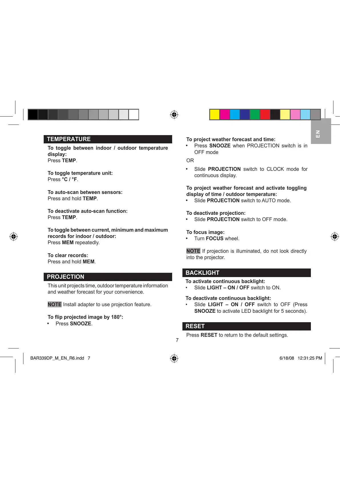 SNOOZE to activate LED backlight for 5 seconds).