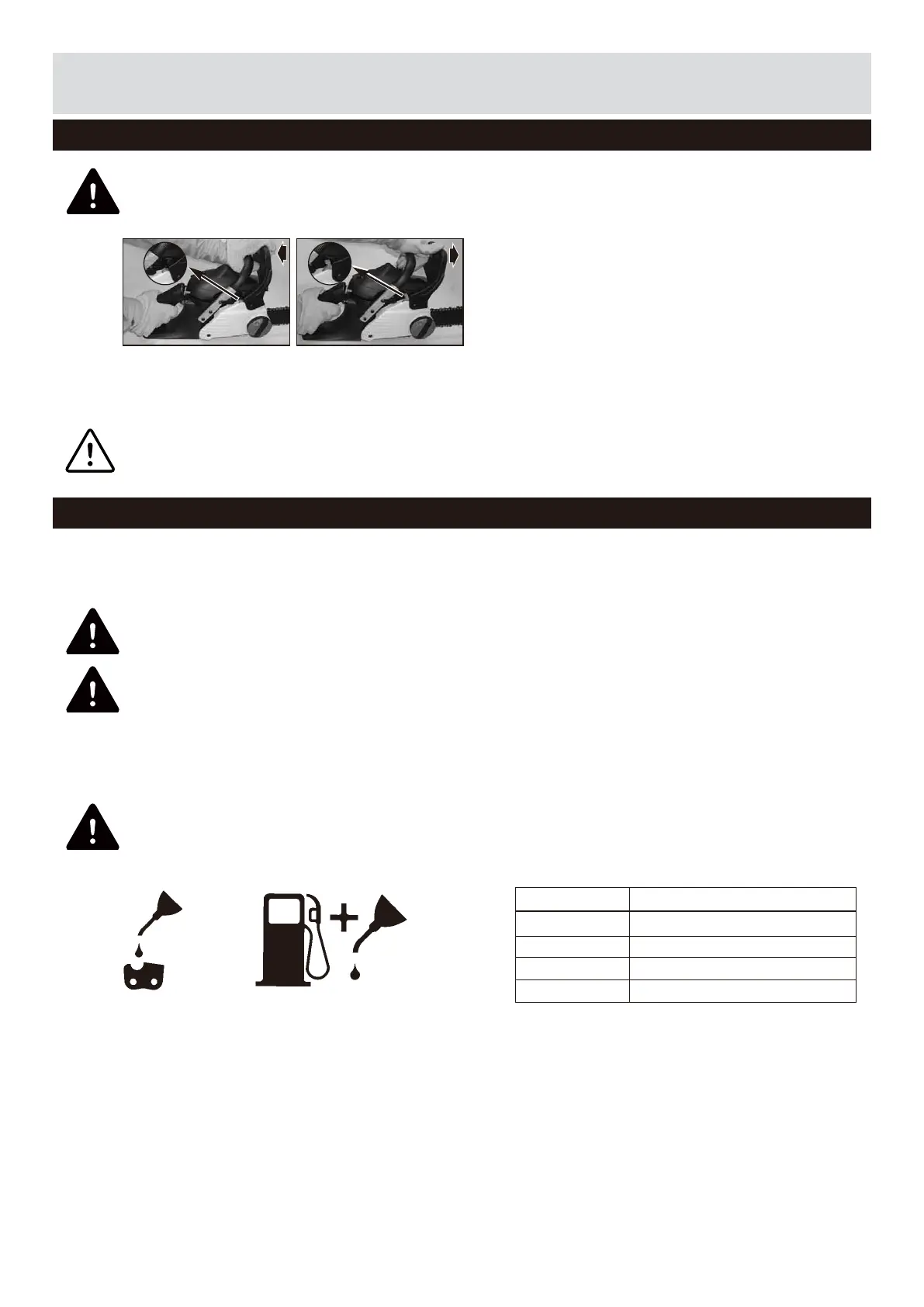 Mix fuel with 2 stroke oil in an approved container.Use mixing table for correct ratio of fuel to oil. Shake