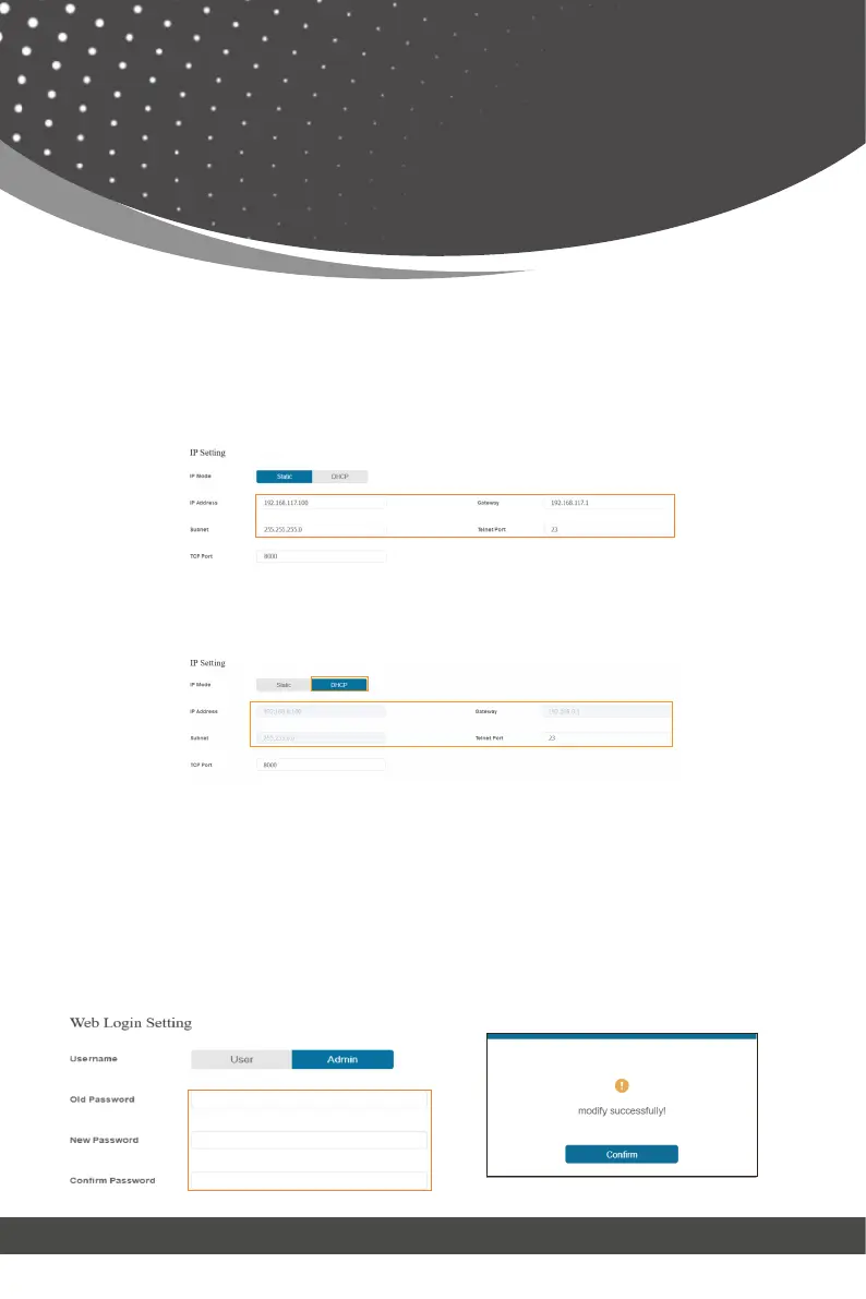Modify the IP Mode/IP Address/Gateway/Subnet Mask/Telnet Port as required,