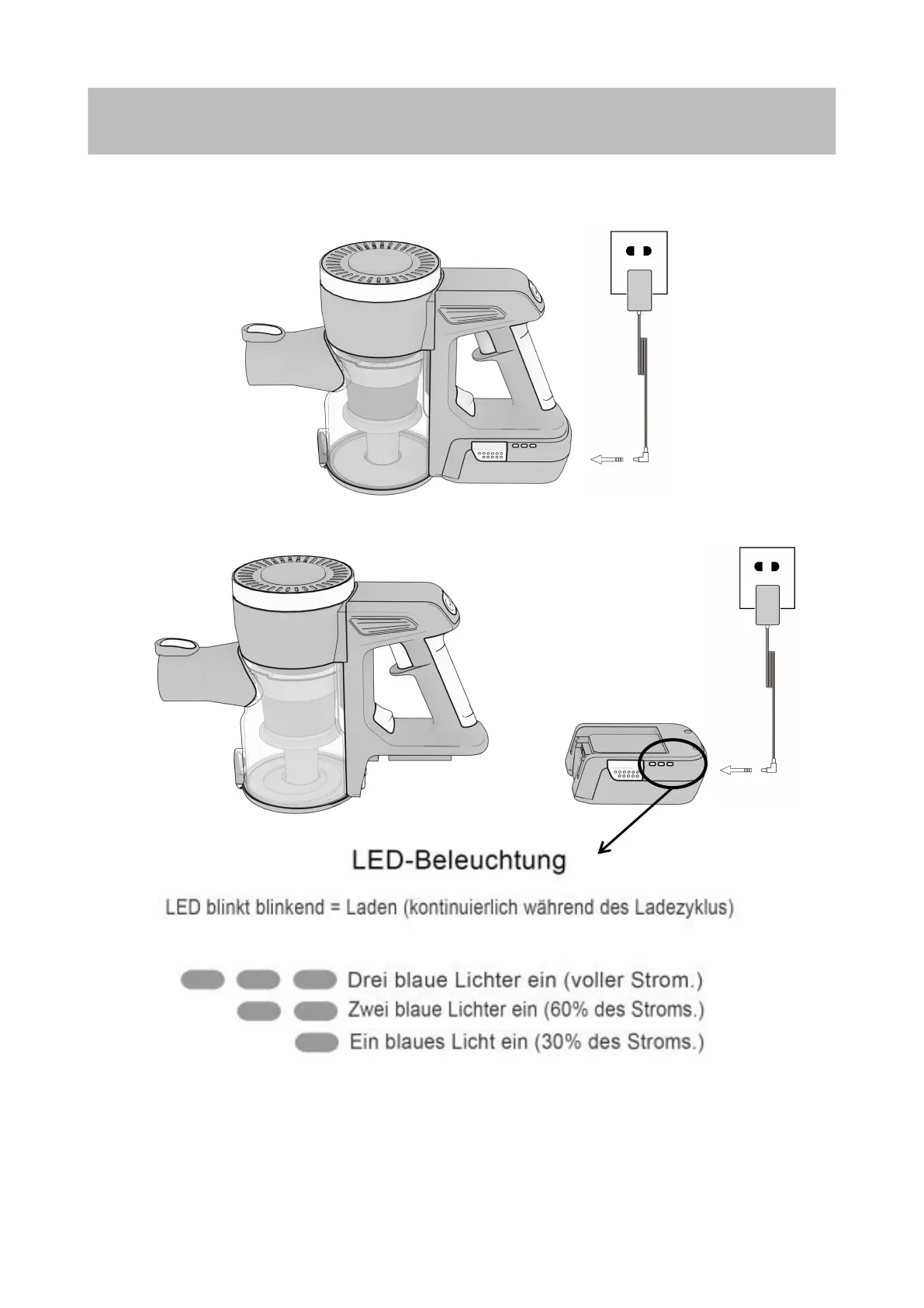 Schließen Sie das Gerät an und laden Sie es auf, bis alle drei blauen LED-Leuchten